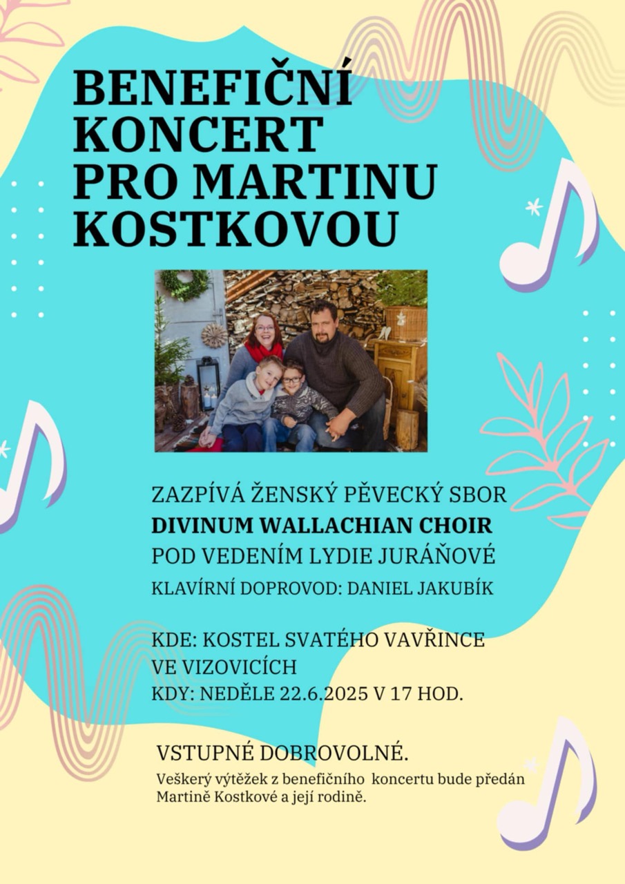 V Kostele svatého Vavřince zazpívá Divinum Wallachian Choir pod vedením Lidie Juráňové. Klavírní doprovod Daniel Kubík. Veškerý výtěžek z benefičního koncertu bude předán Martině Kostkové a její rodině.