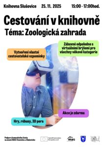 V Městské knihovně ve Slušovicích vás čeká odpoledne plné objevování, her a virtuální reality! Přijďte si vytvořit vlastní cestovatelské vzpomínky, vyzkoušet 3D pera, rébusy a hlavně virtuální brýle, díky nimž navštívíte zoologickou zahradu jako nikdy předtím.