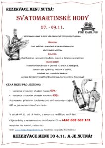 Přijďte si užít tradiční tříchodové svatomartinské menu. Rezervace je nutná.