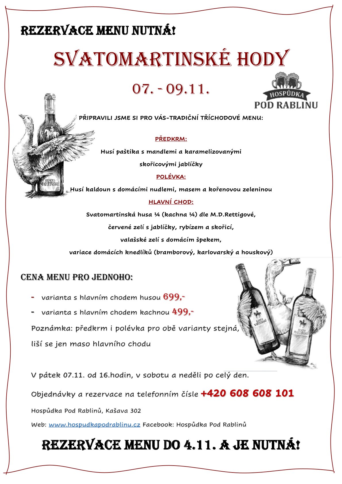 Rezervujte prosím do 4. 11. na telefonu +420 608 608 101.