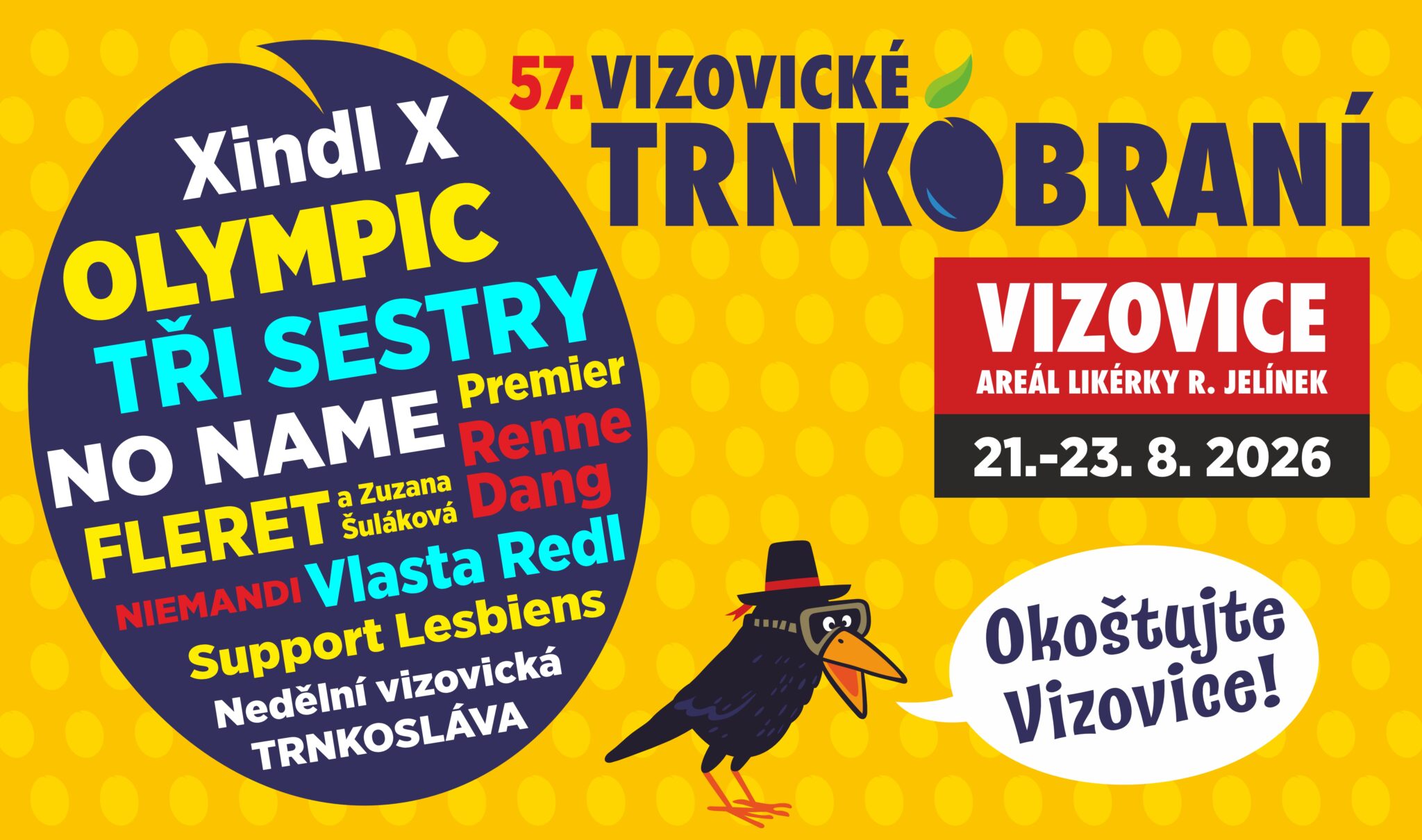 O prázdninovém víkendu 21. až 23. srpna 2026 zahrají v areálu likérky Rudolf Jelínek ve Vizovicích Olympic, Tři sestry, No Name, Xindl X, Support Lesbiens, Premier, Fleret se Zuzanou Šulákovou, Vlasta Redl nebo Renne Dang, který byl před pár dny oceněn jako Objev roku na Českých slavících. Doplní je známé regionální kapely, místní soubory a pestrý doprovodný program v čele s legendární Velkou cenou v pojídání trnkových knedlíků.