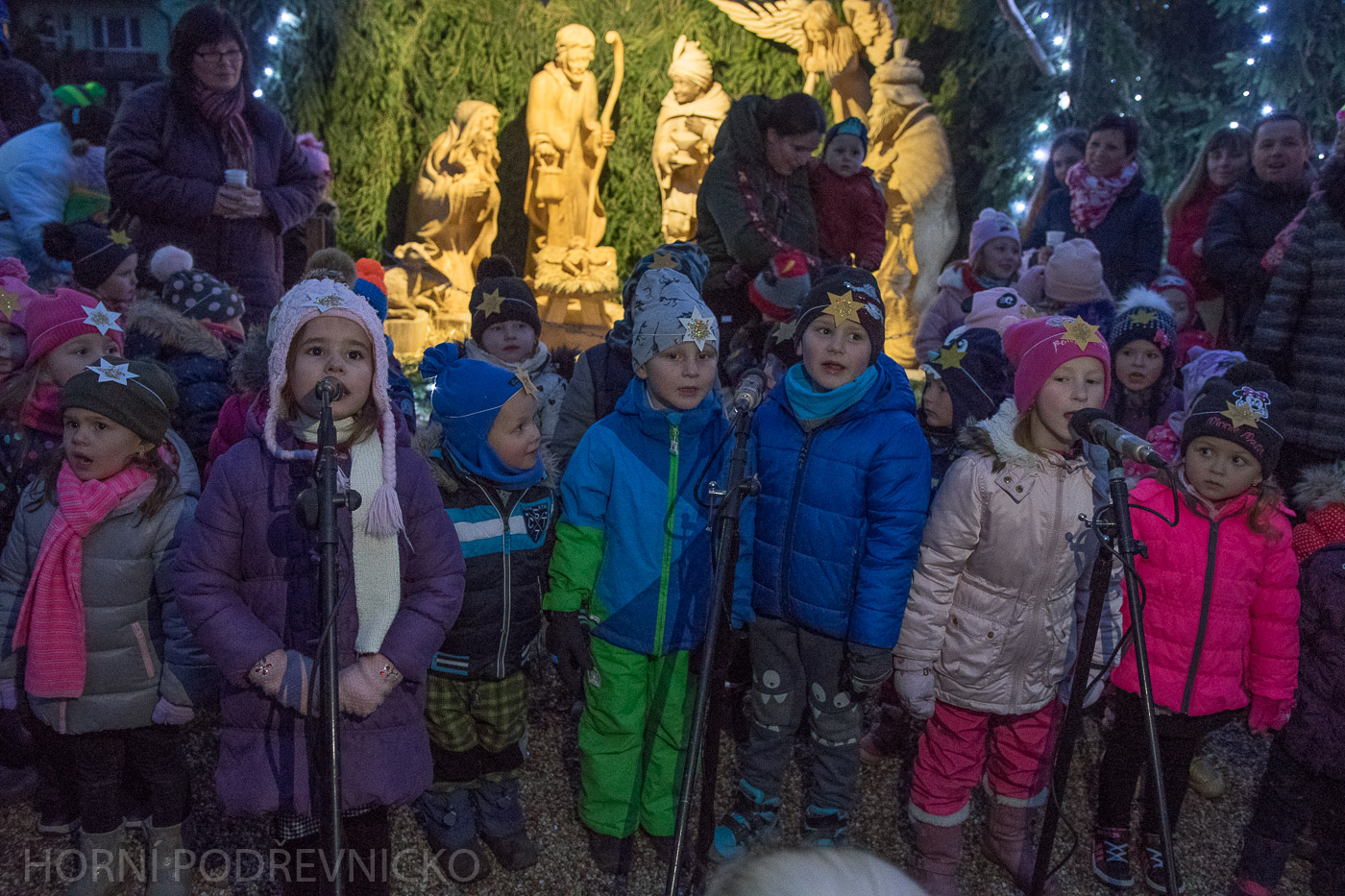 V 16 hodin se pak všichni svorně přesunuli do parku před základní školu, kde byl taktéž jarmark s vánočním zbožím. Po pásmu koled, které za vydatné podpory učitelek krásně zazpívali nejmenší z trnavské školky, se především k jejich radosti a údivu rozsvítil vánoční strom! Nejen trnavští potom obdivovali novou dřevěnou sochu zdejšího unikátního Betléma od rodáka Martina Bořuty. Anděl v pravém horním rohu uměleckého skvostu jakoby včera nad celým děním držel stráž.
