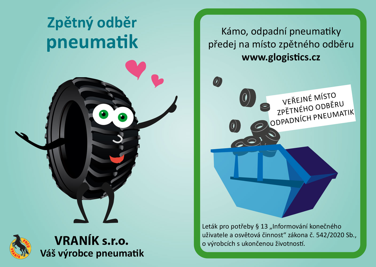 Pneu Vraník nabízí jako největší výrobce a prodejce protektorů v České republice širokou škálu všech značek pneumatik. Naše společnost se chová zodpovědně a v rámci našeho individuálního plnění dle zákona o výrobcích s ukončenou životností zajišťujeme zpětný odběr pneumatik. Každý konečný uživatel může odevzdat běžné množství použitých pneumatik na místech zpětného odběru zdarma. Výběr z více než 650 míst po celé ČR, na kterých můžete své pneumatiky zdarma odevzdat, naleznete na stránce www.glogistics.cz.
